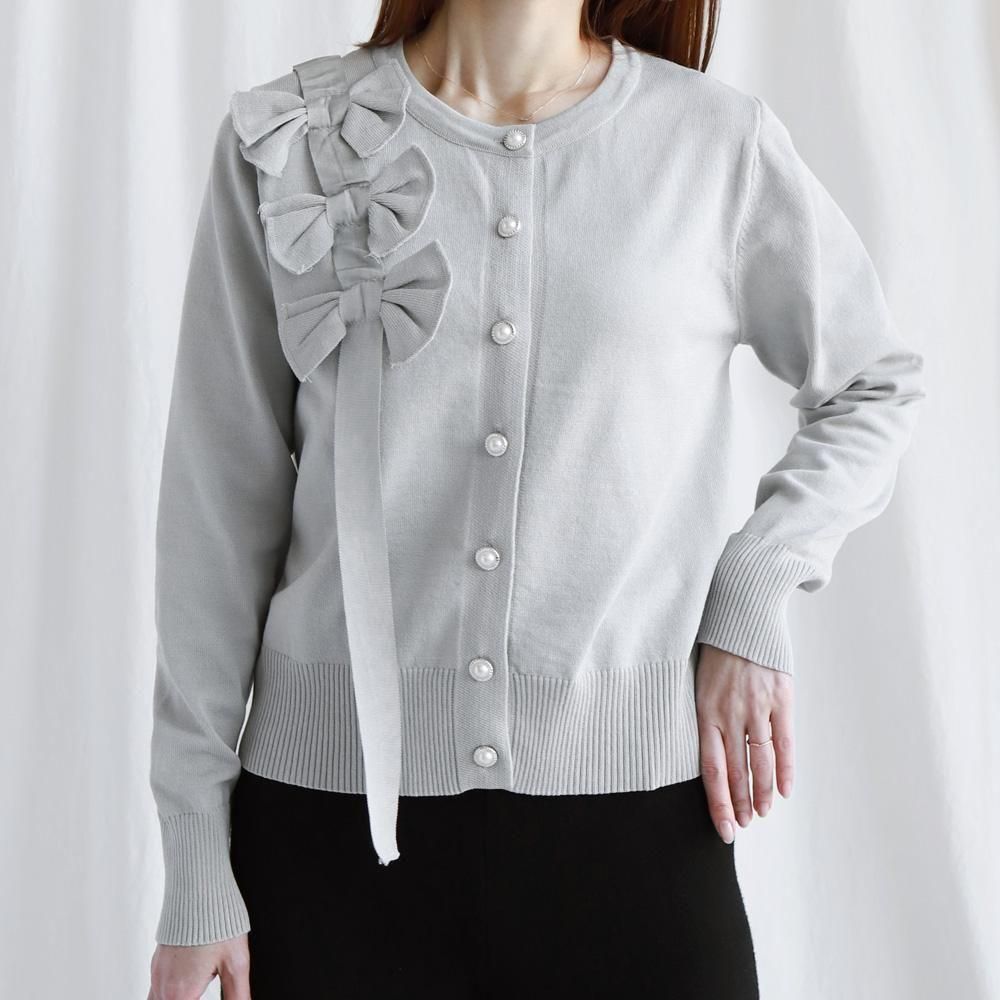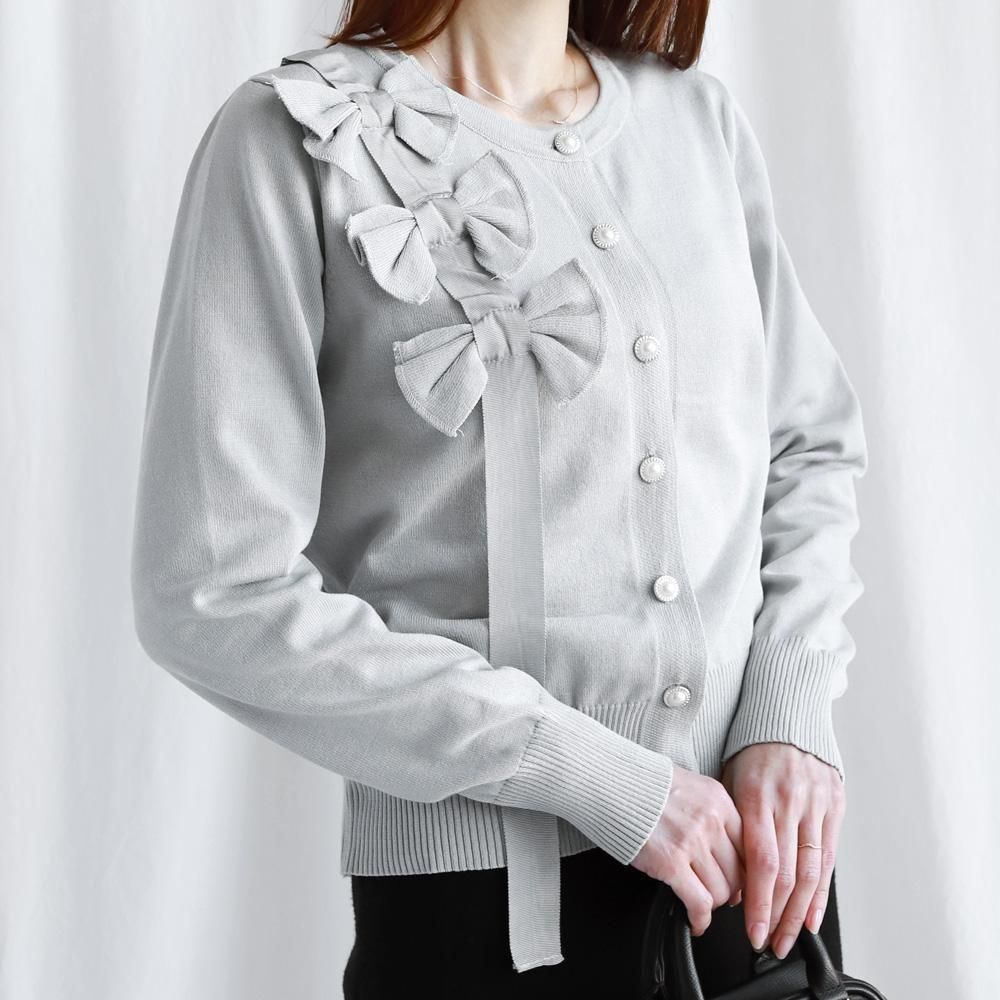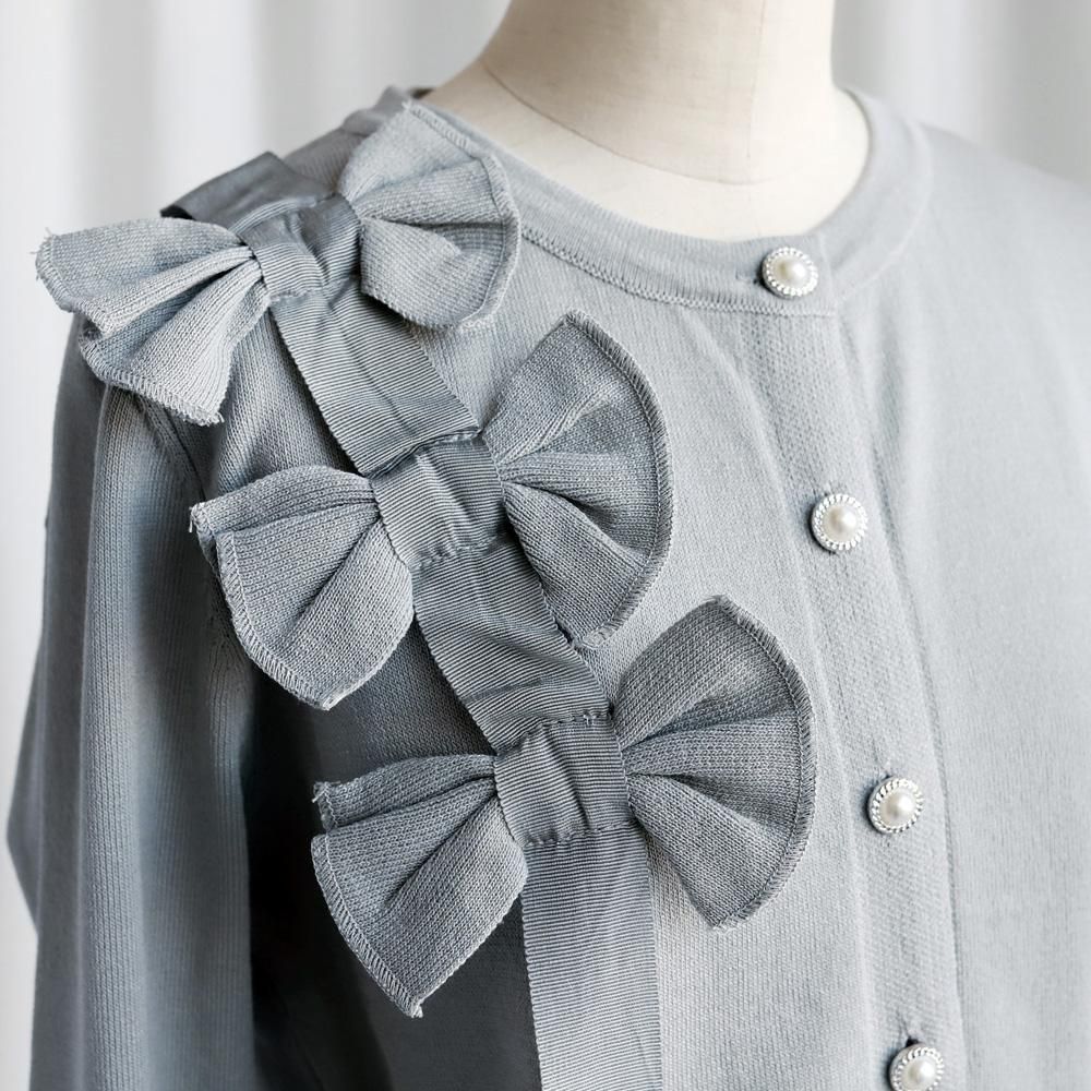 大ぶりのリボンとパールボタンが華やかなカーディガン。