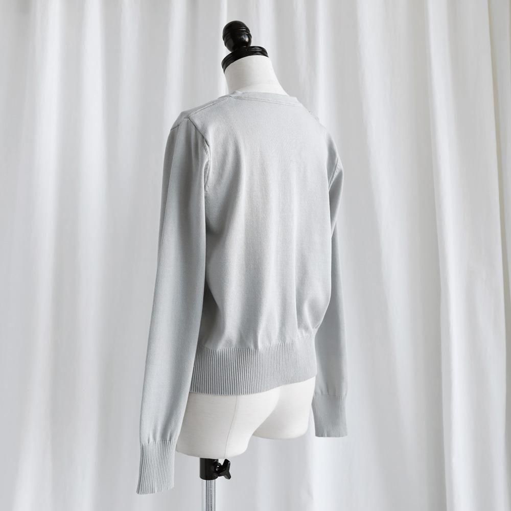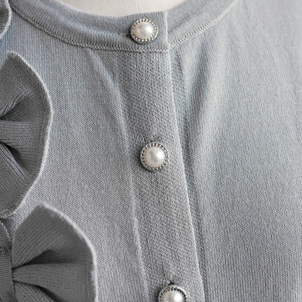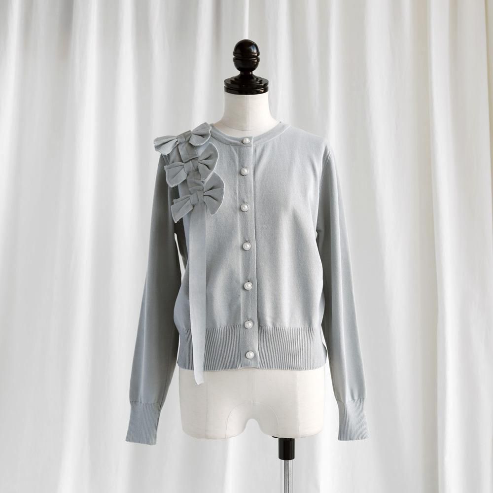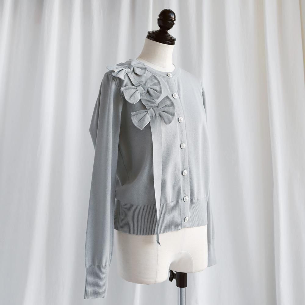 大ぶりのリボンとパールボタンが華やかなカーディガン。