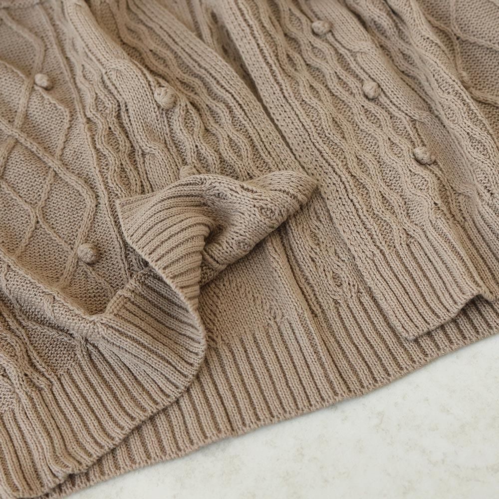 カジュアルなケーブル編みにポンポンを組み合わせたオリジナルニットカーディガン。