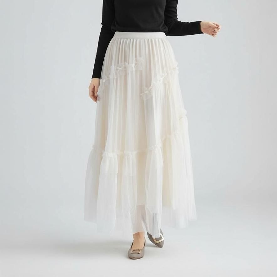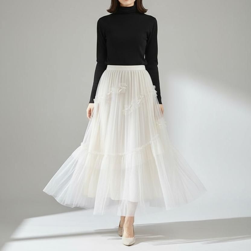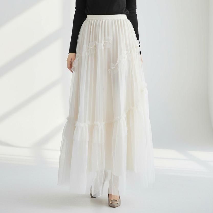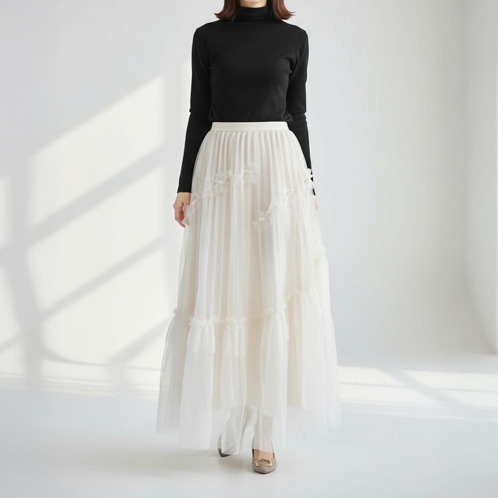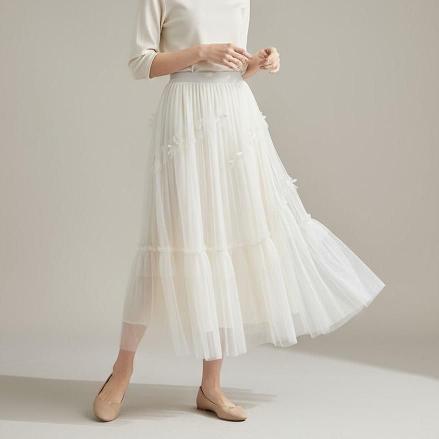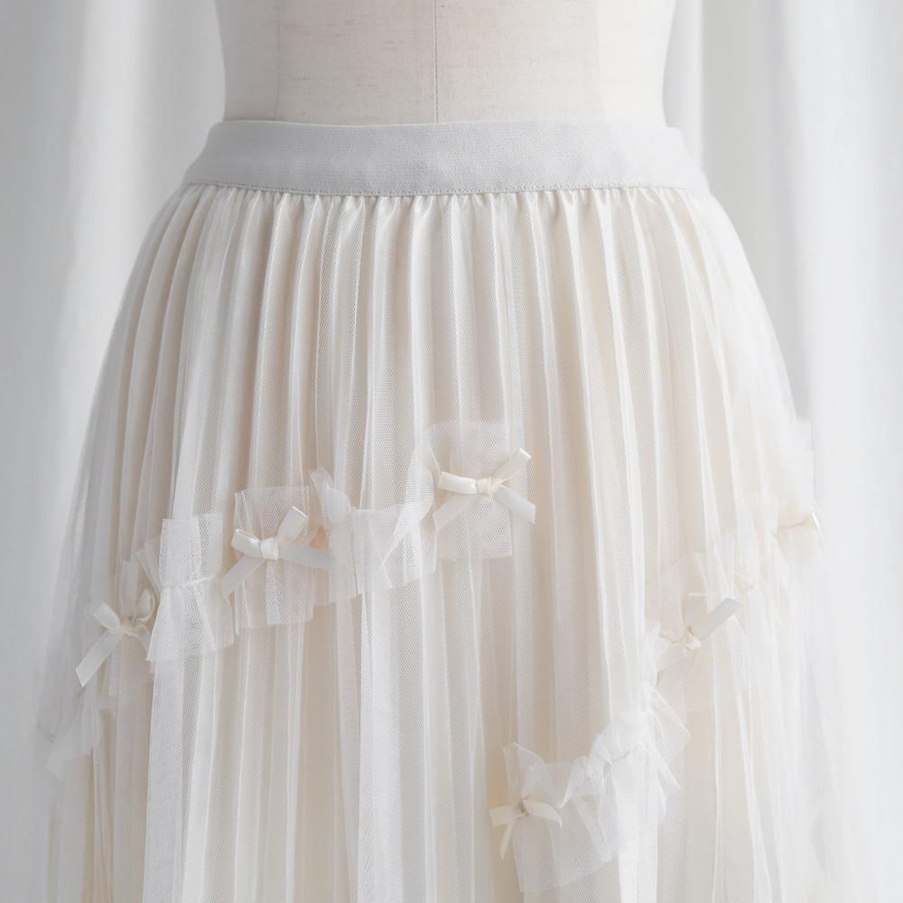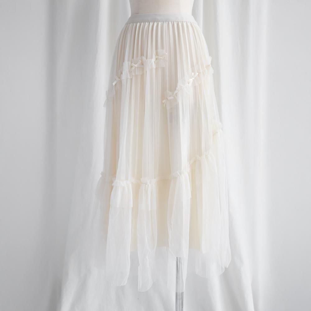 アシンメトリーに重ねたチュールが立体的なスカート。