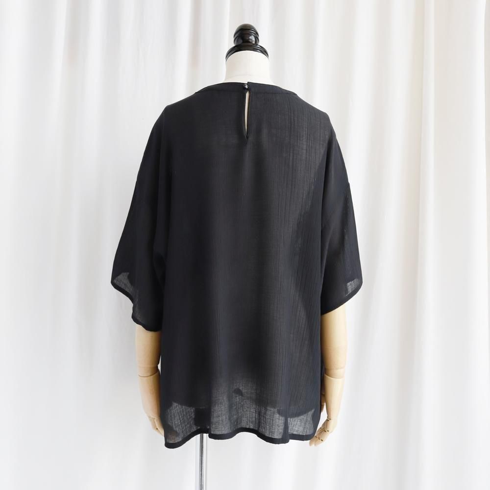 やわらかな肌あたりのレーヨンナイロン楊柳素材に、繊細なレースを重ねた上品なブラウス。