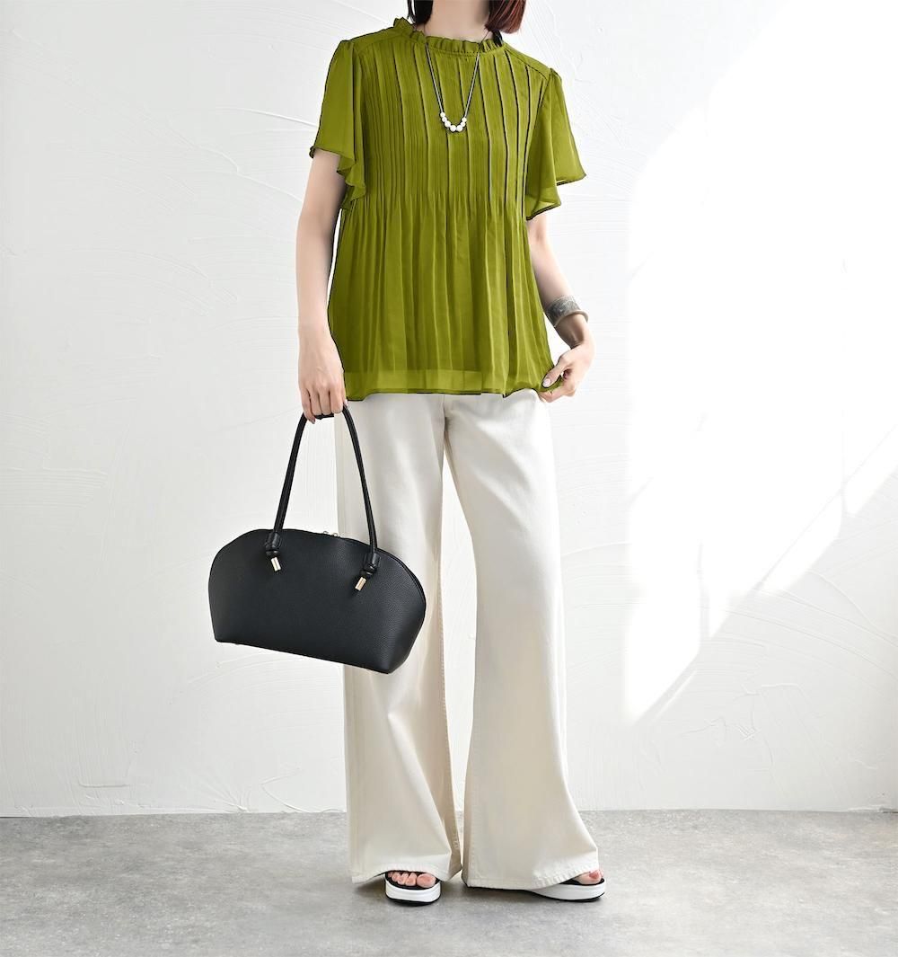 ひらひらと波打つ袖は、腕をほっそりと見せつつ、女性らしいやわらかさを演出。