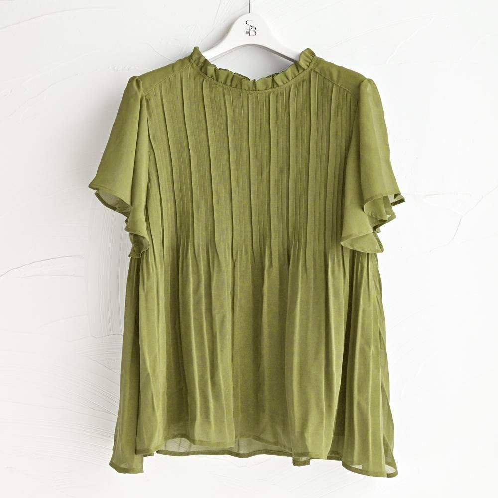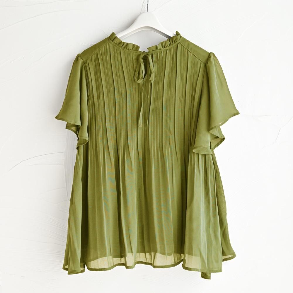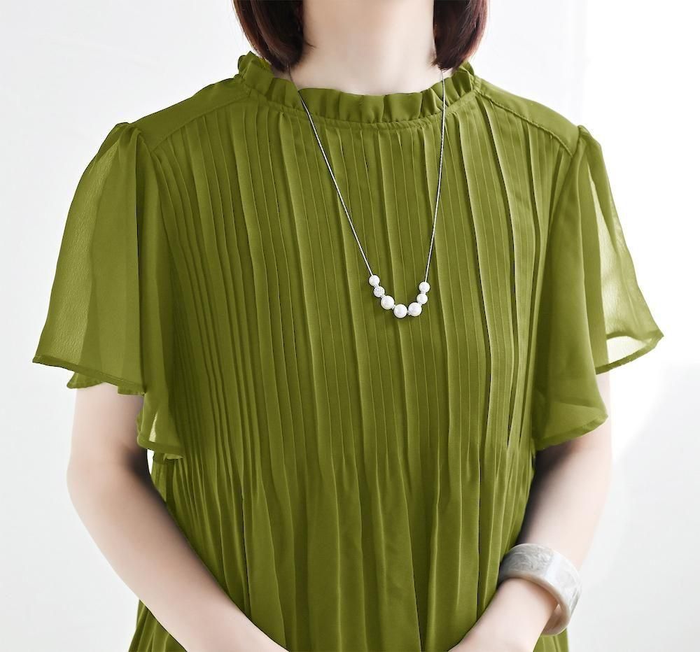 胸下あたりから徐々に消えていく細プリーツはウエスト位置を高く見せて、スタイルアップ効果も。ほんのり透けるシフォン生地ですが裏地付きで安心◎