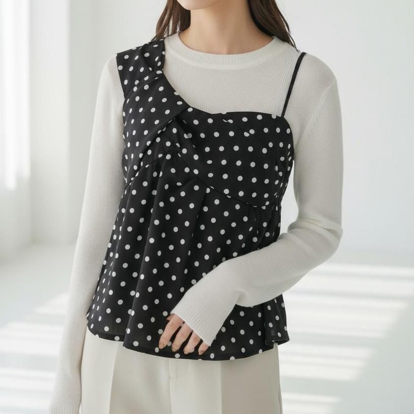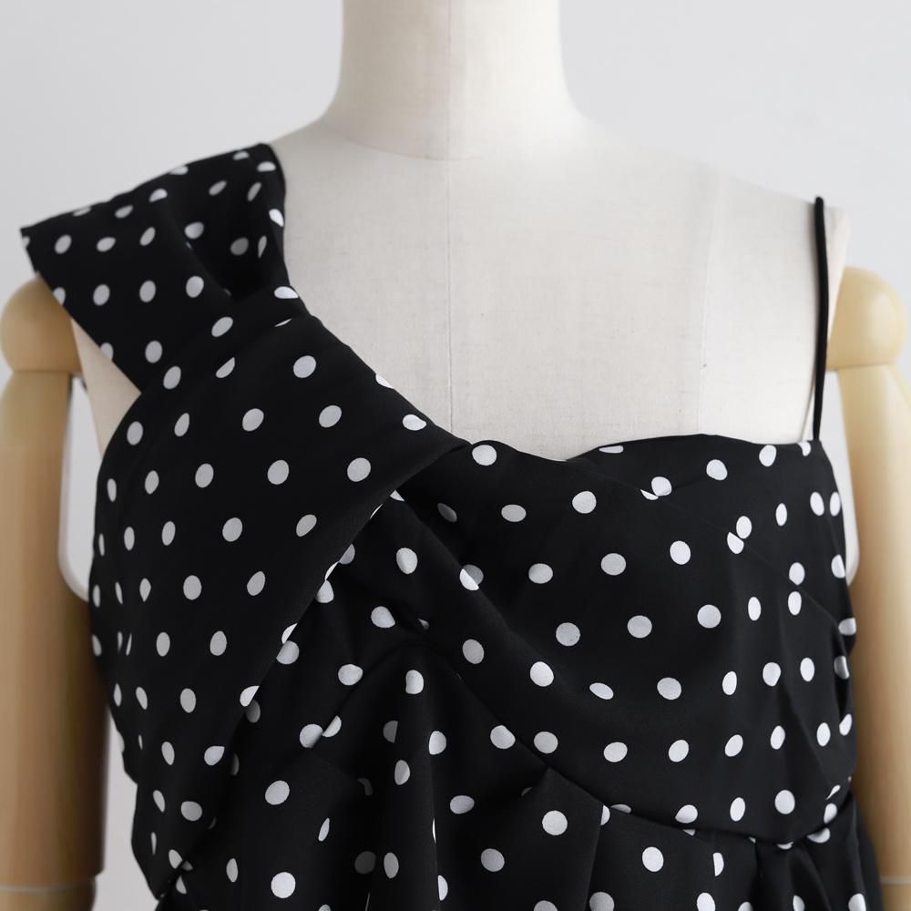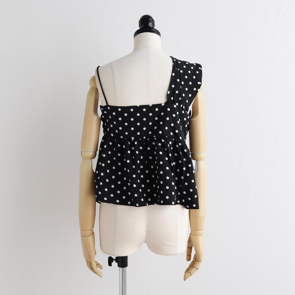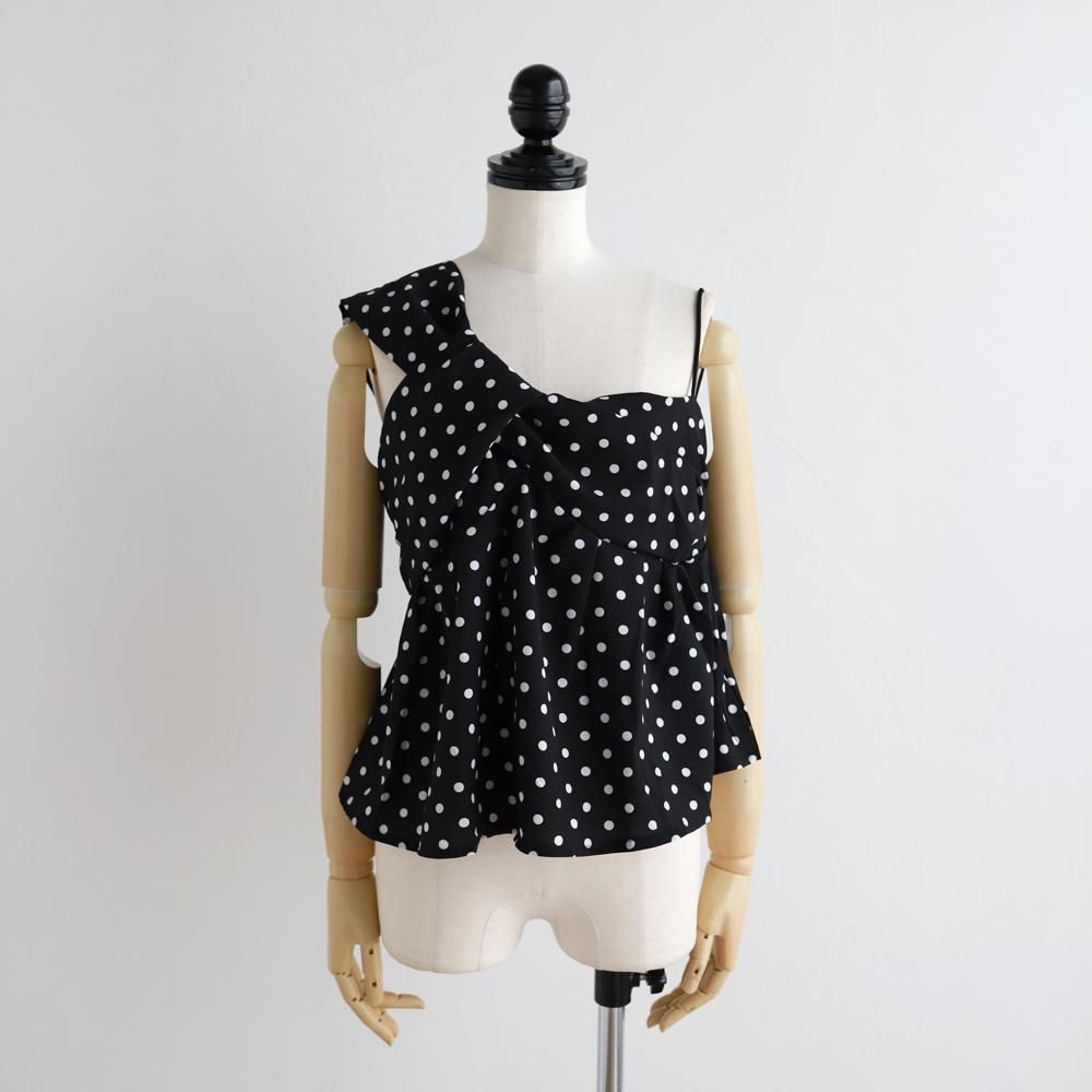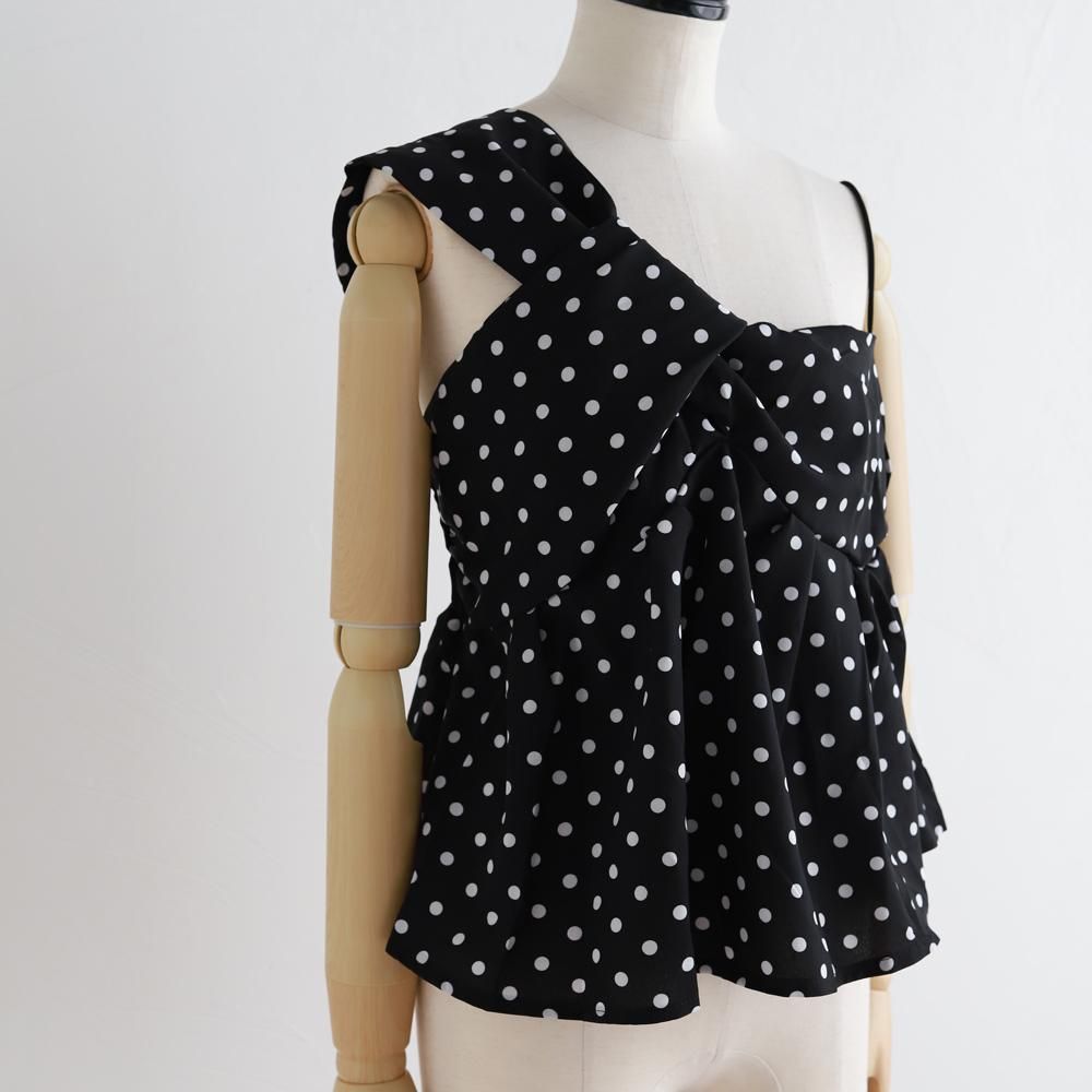 アシンメトリーなショルダーデザインが印象的なドット柄トップス。