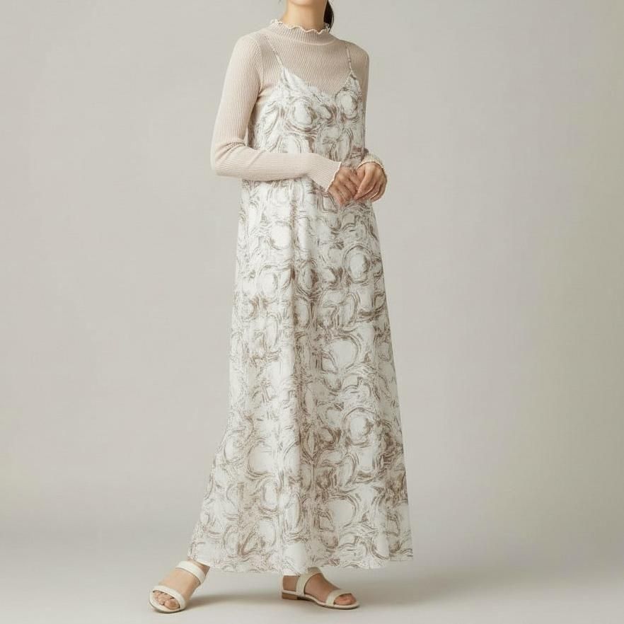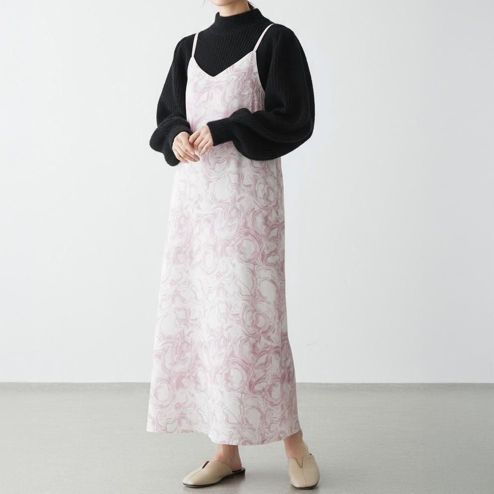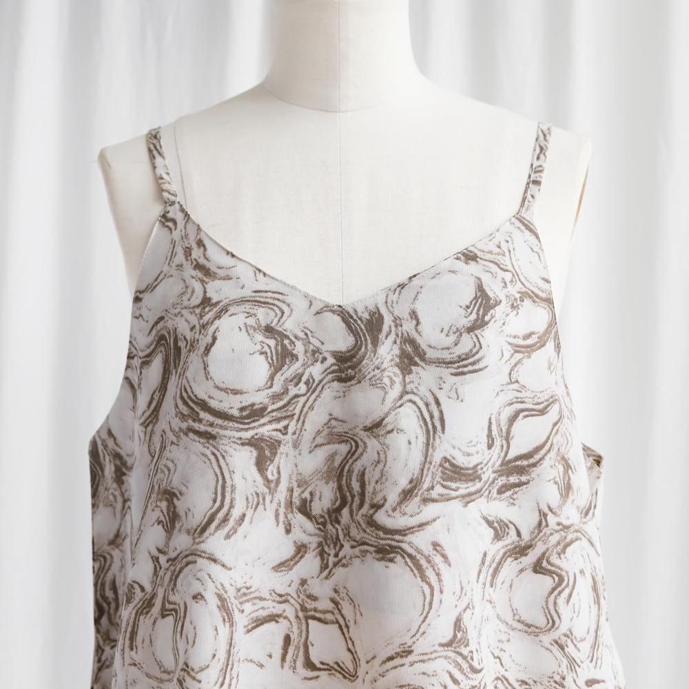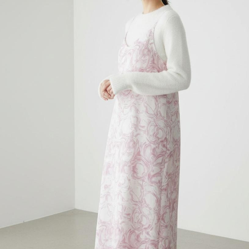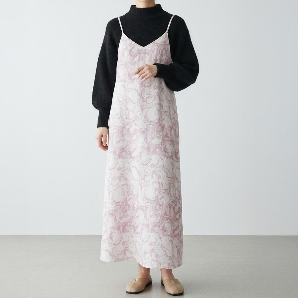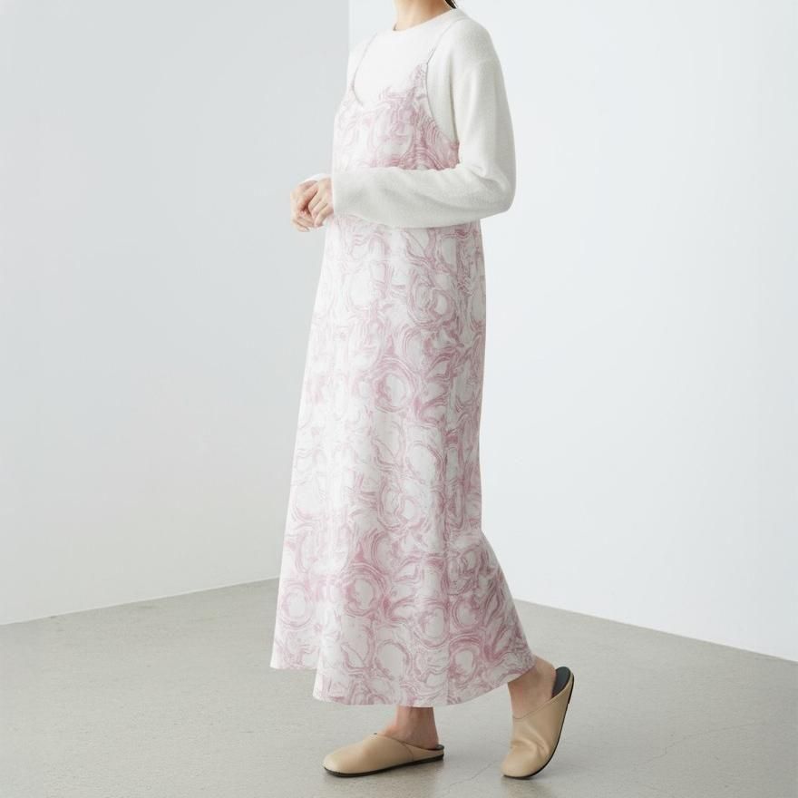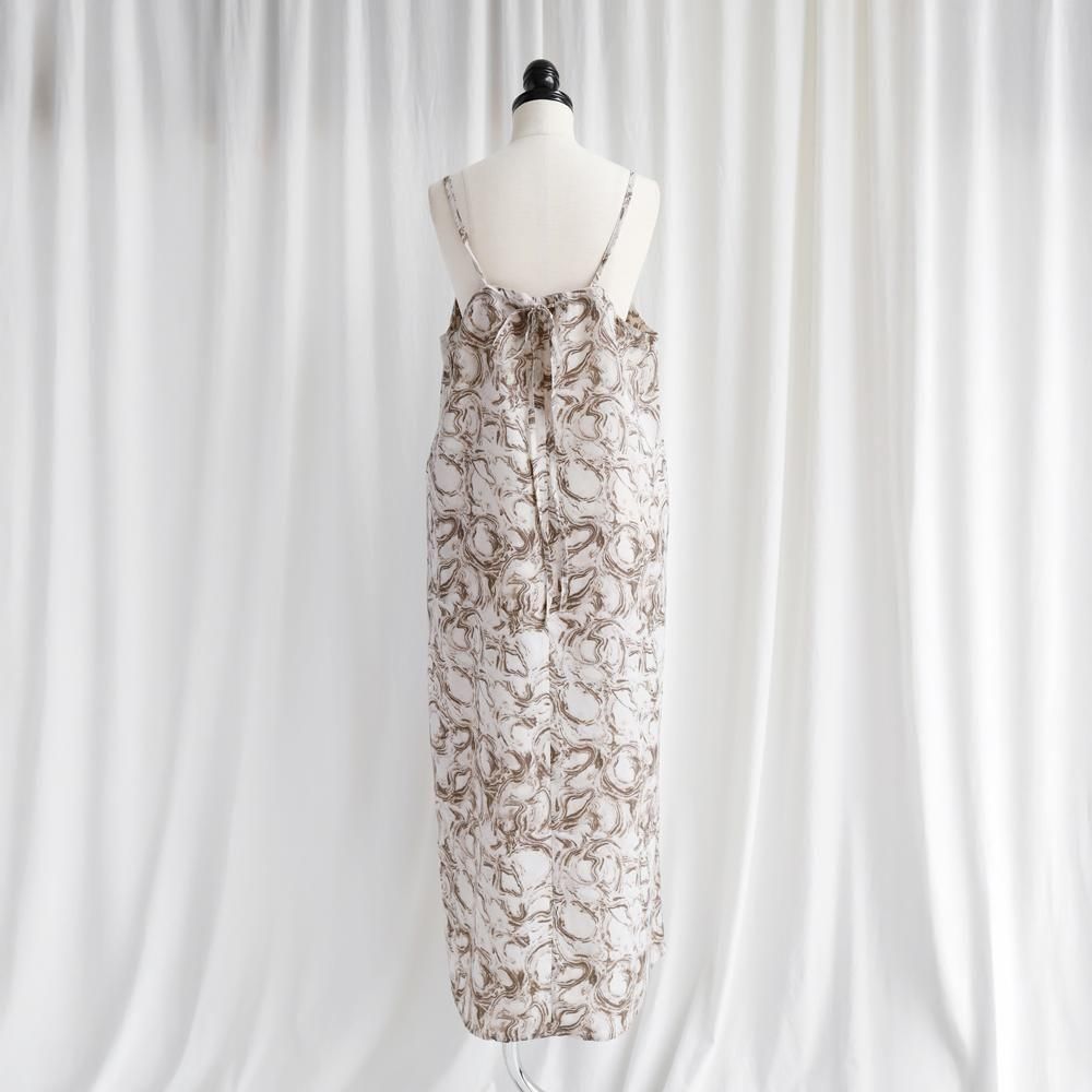 上品なデシン素材に、アーティなマーブル柄をのせた、主役級キャミワンピース。